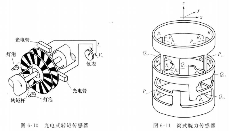 作為例子,國(guó)際斯坦福研究所(SRI) 設(shè)計(jì)的手腕力覺(jué)傳感器如圖6- 11所示。它由六個(gè) 小型差動(dòng)變壓器組成,能測(cè)量作用于腕部x 、y 和 z 三個(gè)方向的力及各軸的轉(zhuǎn)矩。