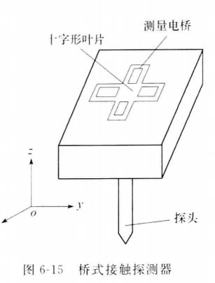 橋式接觸探測器由敏感元件組成,它能夠測量由探 測器施于物體的力F 的三個(gè)分力F, 、F, 和 F₂, 見圖6-15。 探測器的探頭直徑為3mm, 長度為12mm, 它與物體相接 觸,并把壓力傳遞到一個(gè)柔性的十字形葉片上。葉片上 測量電橋
