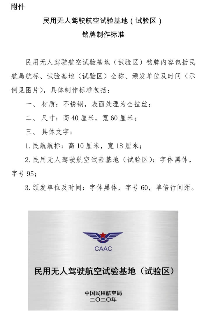請(qǐng)首批民用無人駕駛航空試驗(yàn)基地(試驗(yàn)區(qū))所屬地方政府結(jié)合本地實(shí)際,按照各自目標(biāo)定位,進(jìn)一步加強(qiáng)工作推進(jìn),完善運(yùn)行管理機(jī)制,落實(shí)重點(diǎn)任務(wù),做好試驗(yàn)基地(試驗(yàn)區(qū))建設(shè)和運(yùn)行相關(guān)工作,試出成效、確保安全;并按照統(tǒng)一標(biāo)準(zhǔn)自行制作試驗(yàn)基地(試驗(yàn)區(qū))銘牌(標(biāo)準(zhǔn)見附件2) 。
